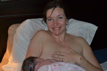 A las 4:00 nació Valentina. La tomé y la puse sobre mi pecho y ahí se quedó, ¡tomando pecho por 20 horas seguidas! Cuando esperábamos que saliera la placenta lloró un poquito y mi hija mayor se puso a llorar de la emoción. Sí, mi hija y mi esposo la vieron nacer, ¡ahí mismo en nuestro cuarto! Mi leche bajó 30 horas después del parto y tuve ayuda de Waleska, de la Liga de la Leche, y todo fue muy tranquilo y lindo, ¡mucho más intenso y lindo de lo que había soñado! Si pudiera lo haría una y otra vez, que Dios bendiga a las lindas parteras, comadronas o cualquier nombre por el que se les llame.